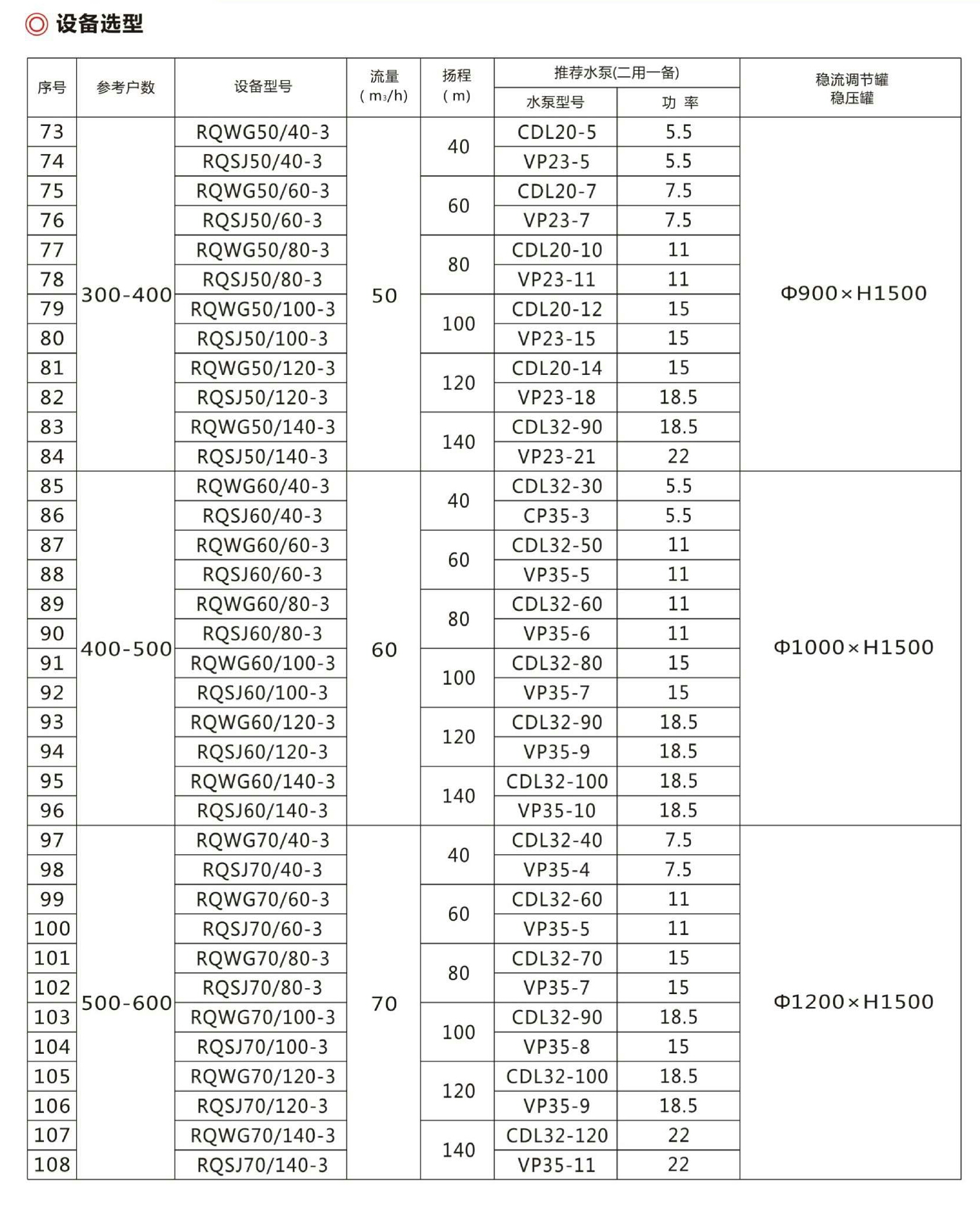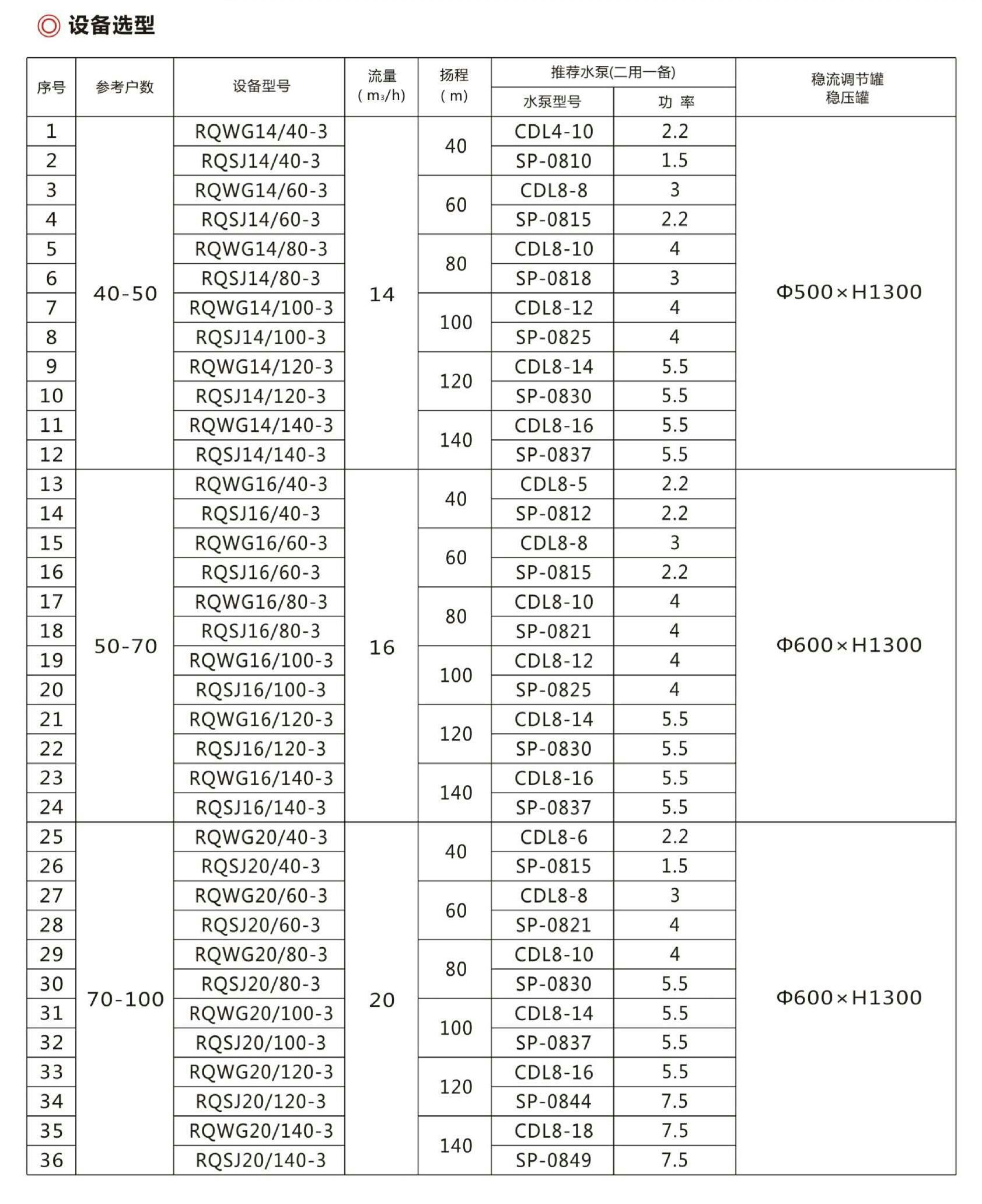 然泉恒压供水设备选型表