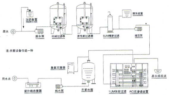 - RX-V系列反渗透纯水机设备。根据国家纯净水标准对饮用纯净水的水质规定和水源水质的实际情况,本系统采用了机械过滤、活性炭过滤、软水器(可选)、精密过滤等设备作为预处理,主机为单级反渗透装置或二级反渗透装置,最后通过臭氧杀菌工艺,功过合理、高效的预处理系统去除颗粒、杂质、胶体、余氯以后,在利用高科技的反渗透膜分离技术去除水中的细菌、病毒等微生物和绝大部分对人体有害的重金属等离子,使产品水符合《GB17323-1998》国家瓶装饮用纯净水标准。